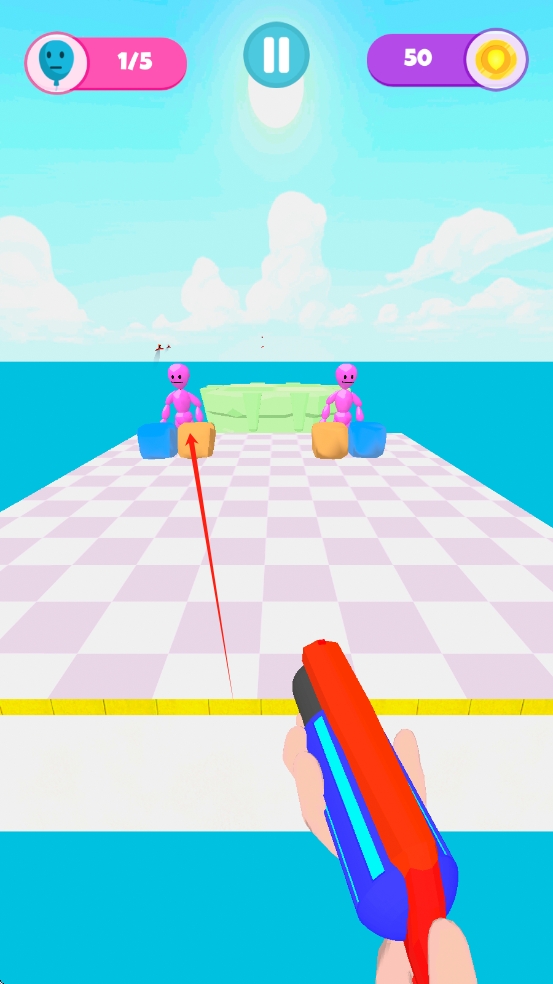 1、基础射击玩法:通过滑动屏幕调整射击视角,点击射击按钮发射子弹,瞄准气球人要害部位,快速将其击破消灭。