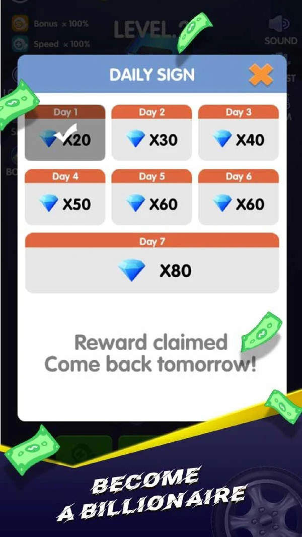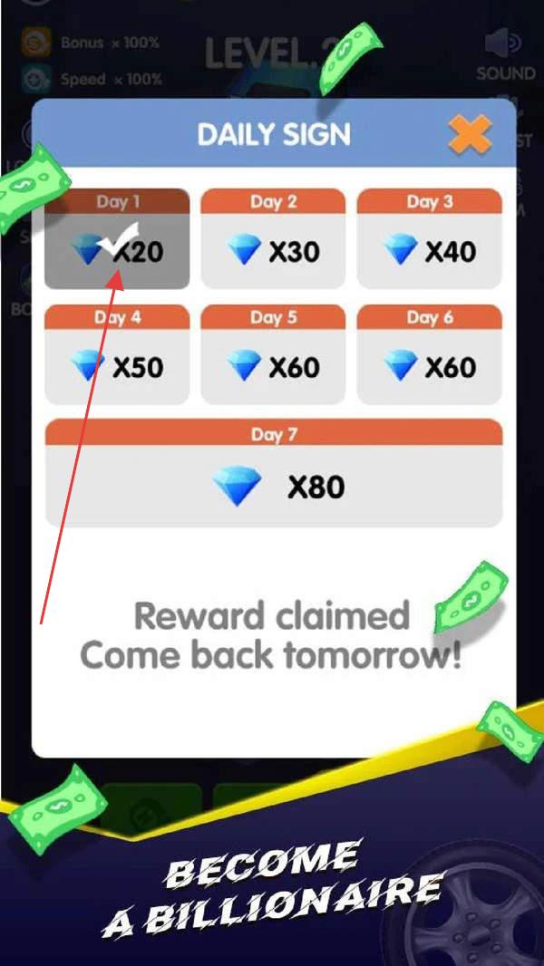 1、游戏设有每日签到系统,在“DAILYSIGN”界面连续签到可获钻石奖励如第一天20颗后续天数递增,记得每日签到积累资源。