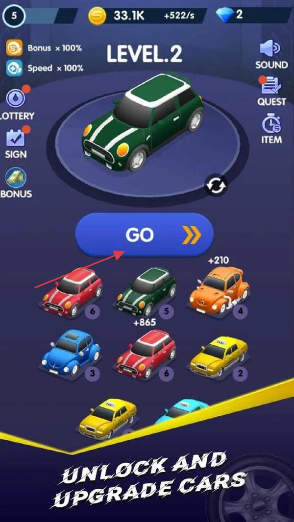 2、进入游戏主界面达LEVEL.2后可见多辆汽车,点击蓝色【GO】按钮开启游戏,可选择汽车进行操作通过游戏进程获取金币等资源。