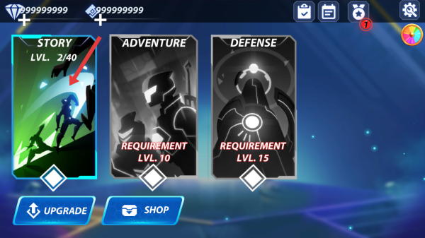 2、在游戏模式选择界面,当前等级满足条件时,点击【STORY】模式开启剧情关卡,提升等级可解锁【ADVENTURE】(需LVL.10)和【DEFENSE】(需LVL.15)模式。