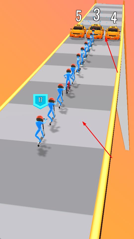 2、道路上存在其他蓝色小人、橙色车辆等障碍,玩家需巧妙操作,躲避或超越这些障碍,确保角色顺利前行。