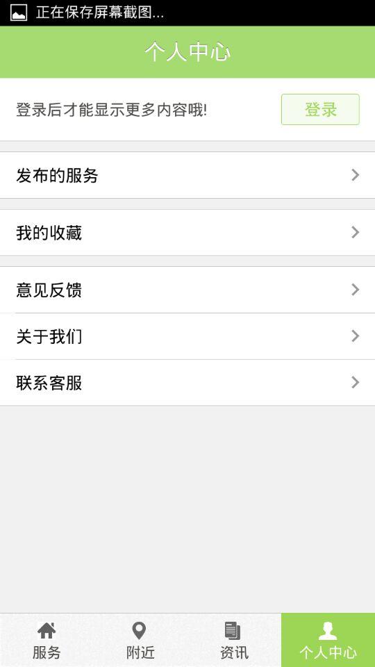 个人中心,登陆后可以发布服务还能看到自己的收藏信息以及随时进行意见反馈