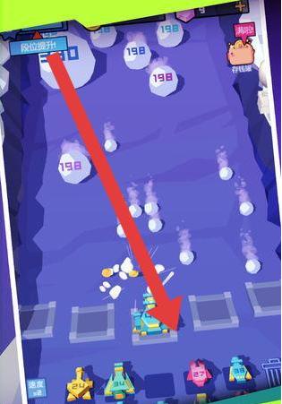 1、进入游戏场景,操控炮台(蓝色装备),按红色箭头方向,清理屏幕中带有数字(如198)的障碍物。