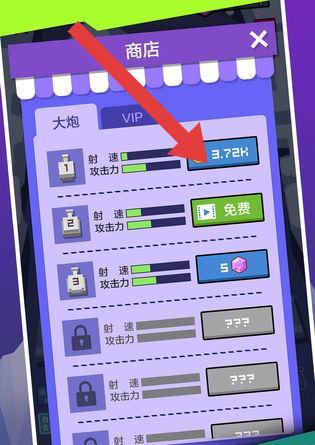 3、打开“商店”界面,选择“大炮”栏目,消耗金币(如3.72k)升级炮台的射速和攻击力,增强战力。