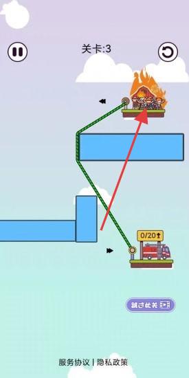 2、在关卡过程,像关卡【3】,要注意规划绳子连接路线,避开障碍,使绳子连接合理,引导消防车到达着火点灭火,完成任务目标。