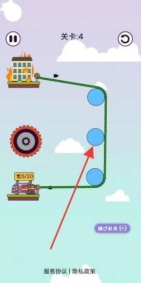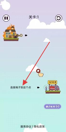 1、进入游戏关卡,如关卡【1】,根据提示找到指定的连接点,将绳子准确连接到该点,这是完成关卡基础操作,确保消防车能顺利行动。