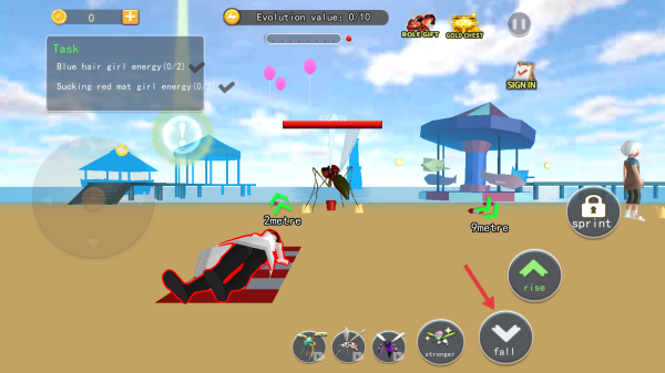 2、游戏中点击右下角【fall】按钮,控制蚊子向下移动,便于寻找目标吸食能量。