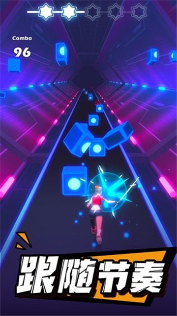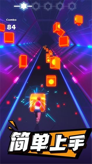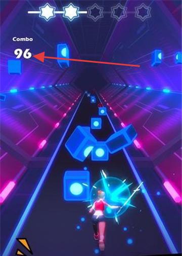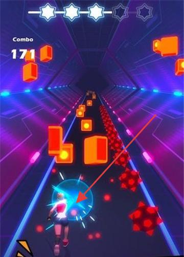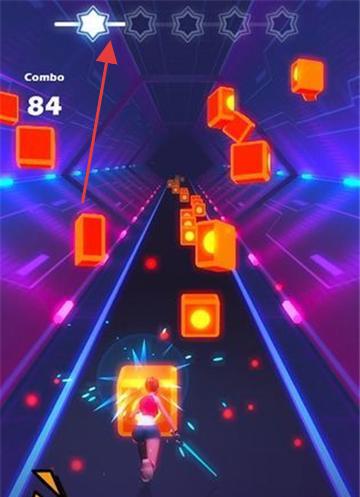 1、进入游戏赛道,操控角色沿着赛道前进,注意观察前方橙色方块障碍物,及时躲避或击碎,同时留意赛道上方的【Combo】计数,保持连击可获取更高分数。