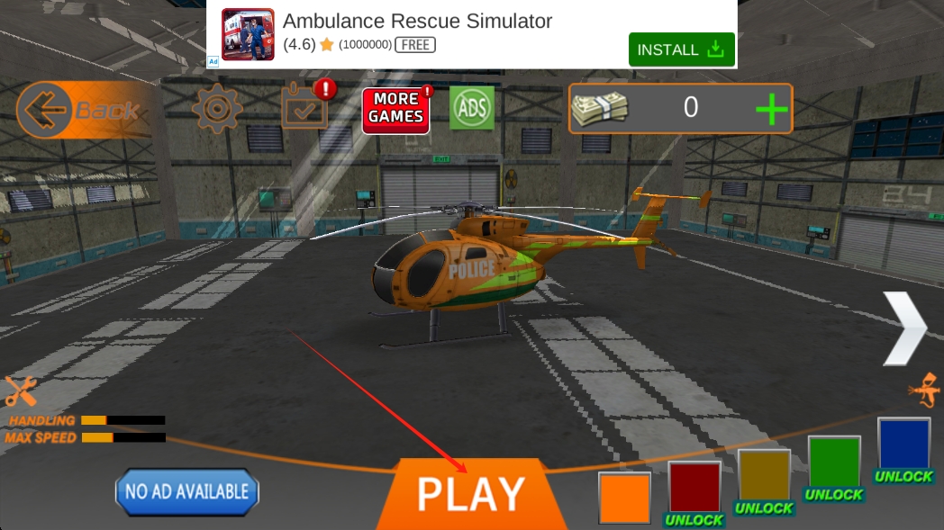 2、在机库界面,点击PLAY按钮,操控直升机开始执行救援任务。