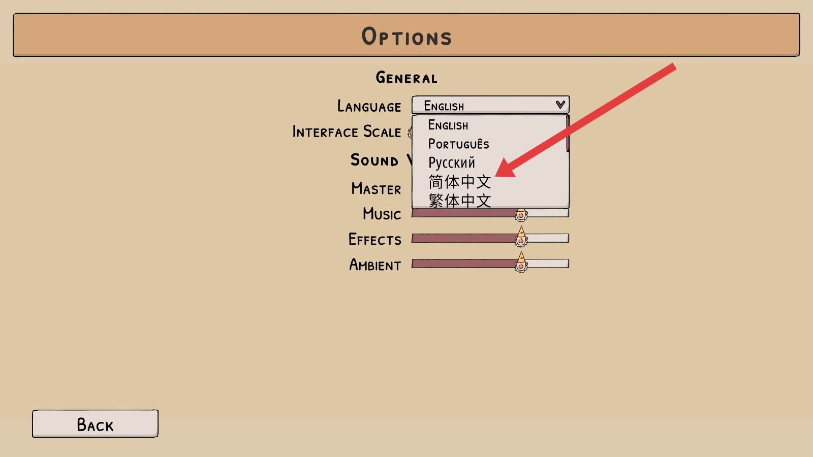 2、点击LANGUAGE下拉菜单,找到简体中文,选择后点左下角返回。