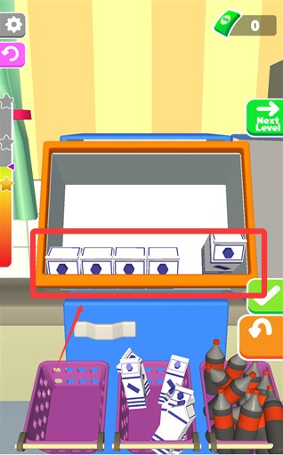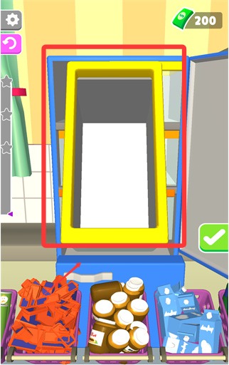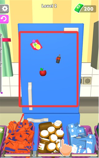 1、每关开始会出现不同数量与形状的物品,所有内容均存放在购物篮中,目标是将它们合理填满冰箱。
