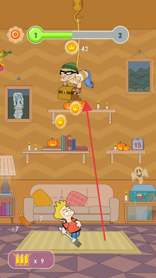 2、在游戏关卡中,操控角色按箭头方向发射道具(如蜡烛),攻击空中目标(如小偷),获取金币(如42),提升关卡进度(如1-2)。