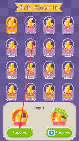 1、进入游戏,参与【Daily Check-In】每日签到活动,点击【Receive】领取当日(Day 1)金币奖励,积累游戏资源。