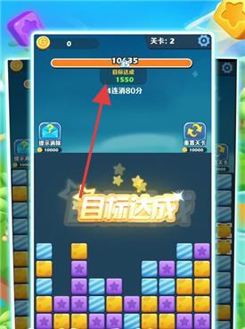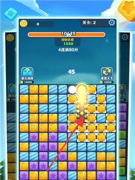 1、进入游戏关卡,观察方块布局,寻找三个及以上相同颜色方块连成一线的组合,通过点击或滑动操作进行消除,积累分数。