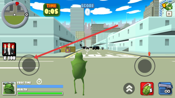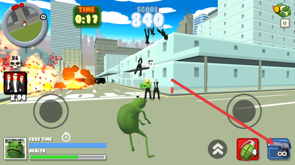 3、发现敌方单位进入射程时,点击屏幕枪械图标,操控青蛙向目标发射弹药,消灭敌人完成关卡任务。