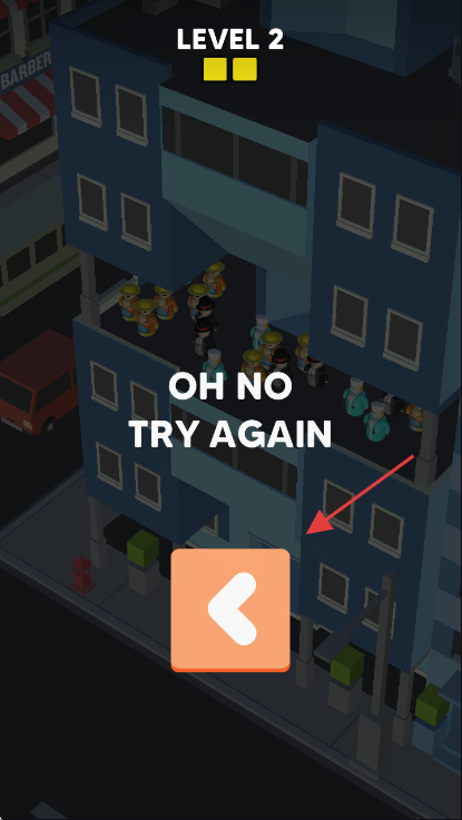 3、关卡失败显示【OH NO TRY AGAIN】,点击橙色箭头按钮重新挑战当前关卡。