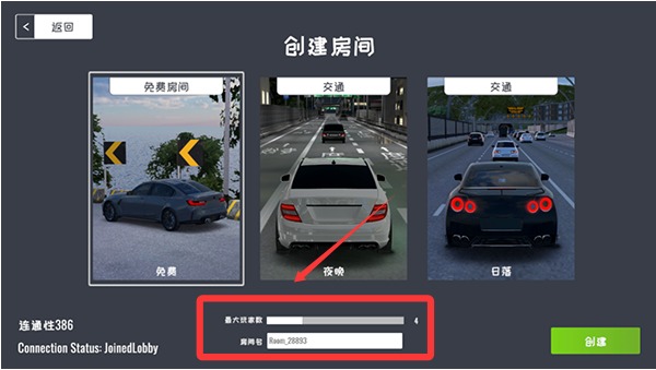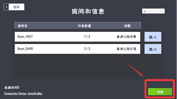 2、连接在线模式后,可看见当前在线房间、人数、地图等,点击进入便可以进入别人房间,接下来点击右下角创建。