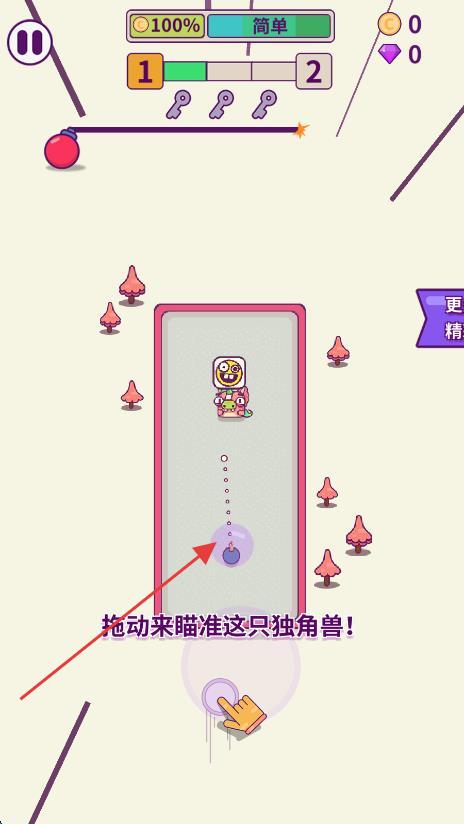 1、进入指尖炸弹关卡,倒计时开始后,滑动屏幕调整炸弹弹射角度,瞄准坏兔子密集区域发射,利用碰撞反弹消灭敌人。