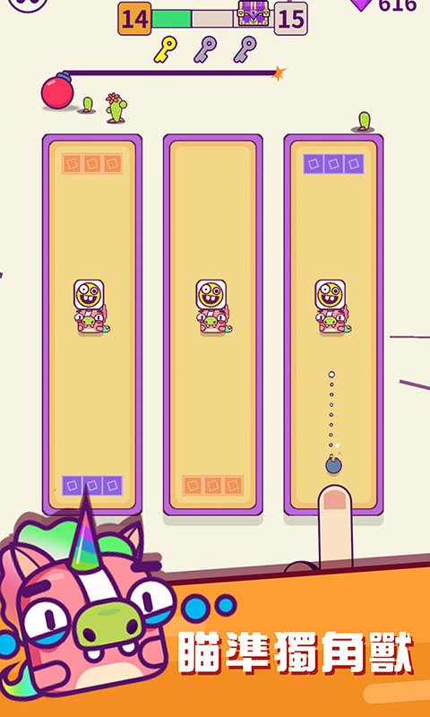 2、道具策略组合:解锁“分裂炸弹”“穿透射线”“时间延长”等道具,根据关卡特性搭配使用,如用分裂弹应对密集敌人。