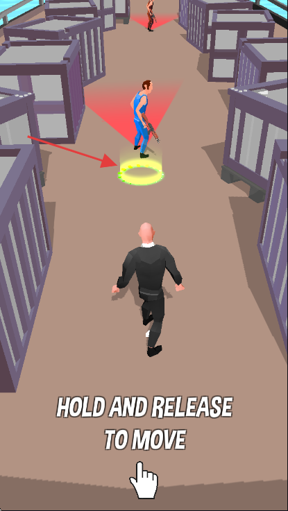 1、在游戏场景中,按照提示【HOLD AND RELEASE TO MOVE】操作,控制角色移动,避开敌人的红色视野范围。