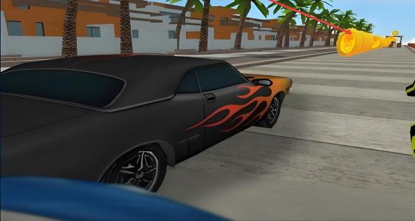 1、在史蒂夫特技赛车的游戏中,注意收集道路上的金币,如图中箭头所指,积累金币以获取更多游戏资源。