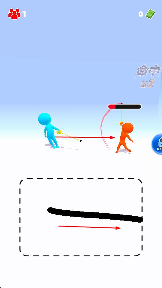 1、玩家操控蓝色小人,通过拉拽绳索等方式,对橙色、紫色等敌人发起攻击,命中敌人可造成伤害。