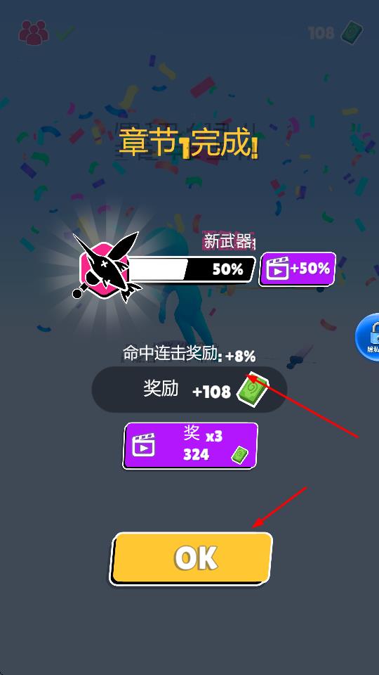 3、玩家成功击败敌人,完成章节任务,可获得金币等奖励,并可点击“OK”推进到下一章节继续游戏。