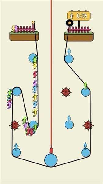 1、路径规划解谜:观察场景布局与机关分布,从多条前进路径中选择最短路线,利用绳索攀爬、荡摆等操作穿越障碍,接近被困火柴人。