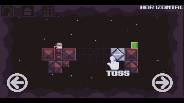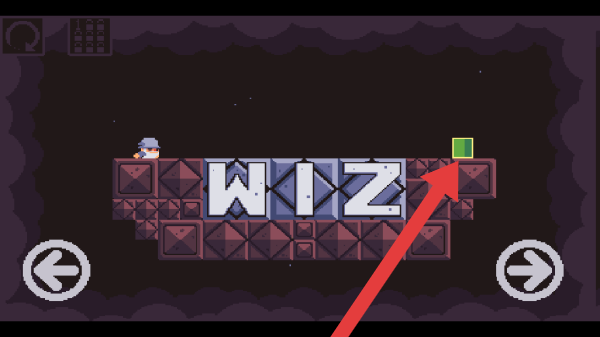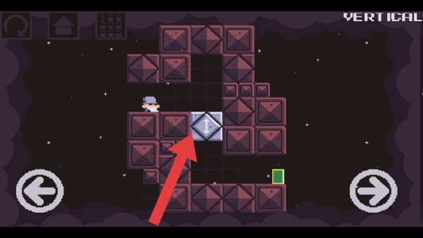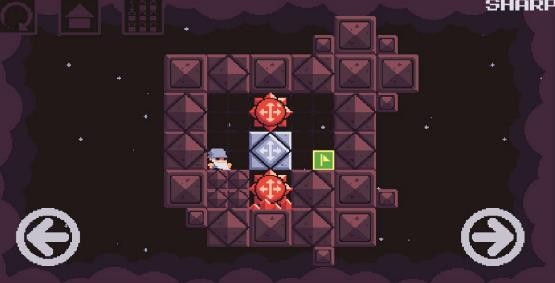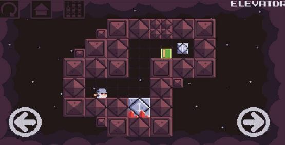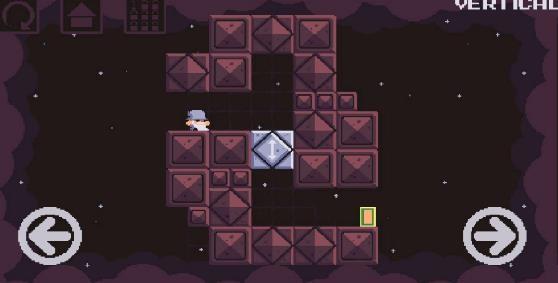1、画面采用像素风格,展示了一个场景,场景中有由方块构成的平台,画面左右两侧有控制方向的箭头按钮,整体呈现出典型的冒险解谜画面风格。