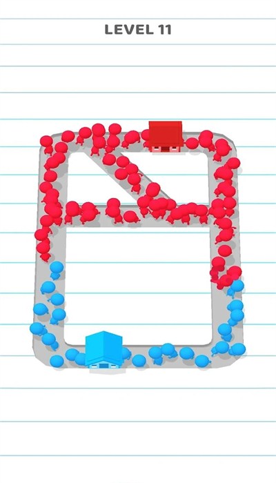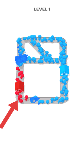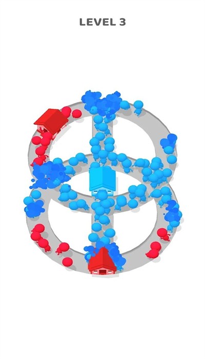 2、图中有红蓝两色类似小人的图形,红色图形聚集在左下角红色房屋状物体附近,蓝色图形分布在灰色路径上,整体是一款阵营对抗的益智类游戏。