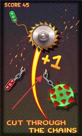 3、玩家需要操作类似锯片的道具去切割链条,每成功切割链条可能会获得分数加成,像图中显示的“+1”,并不断积累分数。