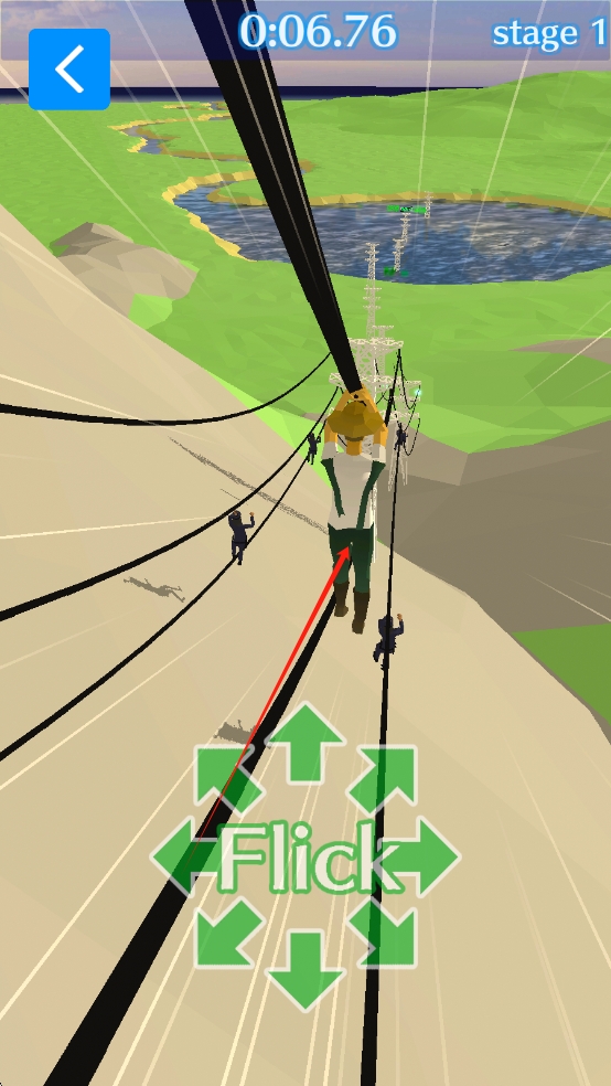 1、进入高压线绳索,玩家操控角色站上高压电线,紧握绳索,滑动屏幕控制滑行方向,准备迎接首波障碍与电流。