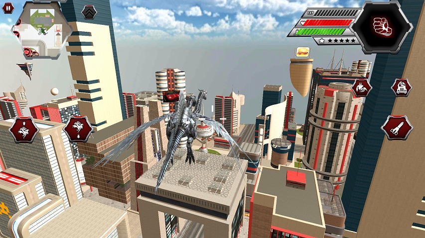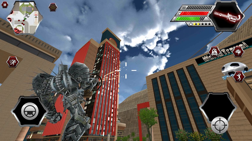 3、操控机械角色在高楼间移动,利用技能按钮(如飞行、射击等技能图标)探索城市,完成任务。