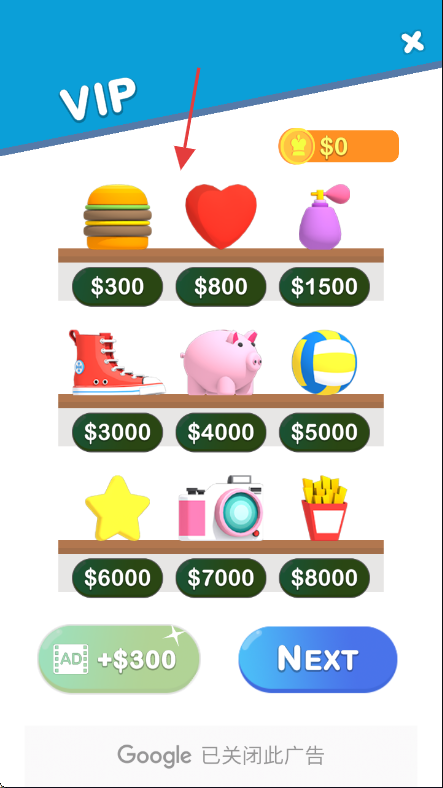 3、VIP界面中根据金币数量选购物品如【汉堡】等,合理规划资源,点击【NEXT】按钮延续游戏进程。