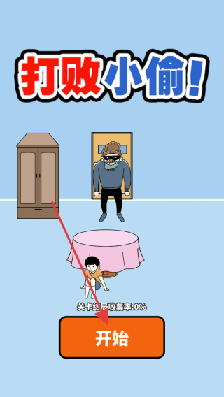 1、进入游戏,看到【打败小偷!】和【开始】按钮,按箭头指示点击【开始】,进入关卡选择界面。
