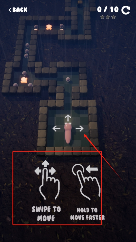 2、操控蠕虫时,通过滑动屏幕使其移动,按住屏幕可让蠕虫移动速度加快。