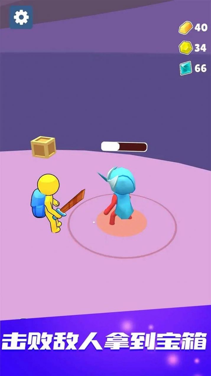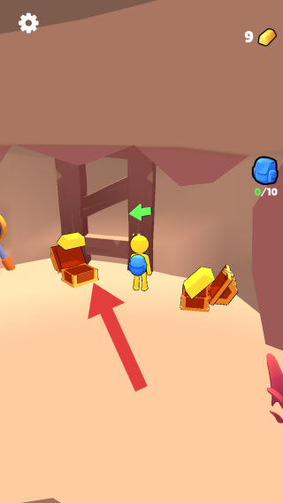 2、展示了卡通风格的画面,图中有一个身着蓝色衣物的黄色小人角色,周围有几个打开的宝箱,内部有黄色物品,玩家需操控角色收集物品推进。