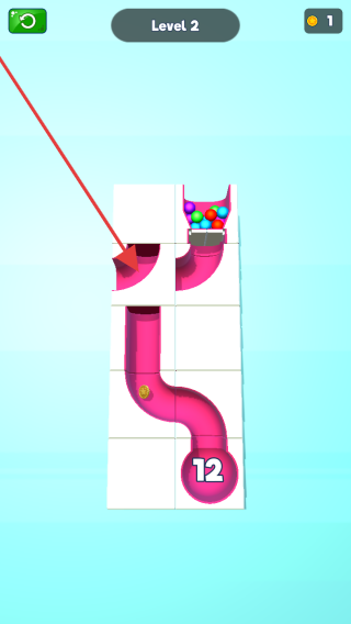 2、进入【Level 2】关卡,依照箭头方向,点击管道起始处,使彩色球在粉色管道中移动,同样要让球落入标有【12】的区域,完成关卡。