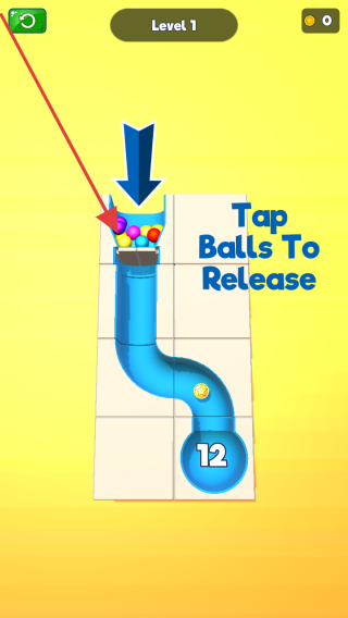 1、在【Level 1】关卡,看到【Tap Balls To Release】提示,按箭头指示点击管道内的彩色球,让球沿管道下落,目标是落入标有【12】的区域。