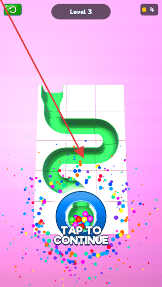 3、来到【Level 3】关卡,按箭头所指点击管道,让彩色球在绿色管道中流动,球落入目标区域后,看到【TAP TO CONTINUE】提示,点击屏幕进入下一关。