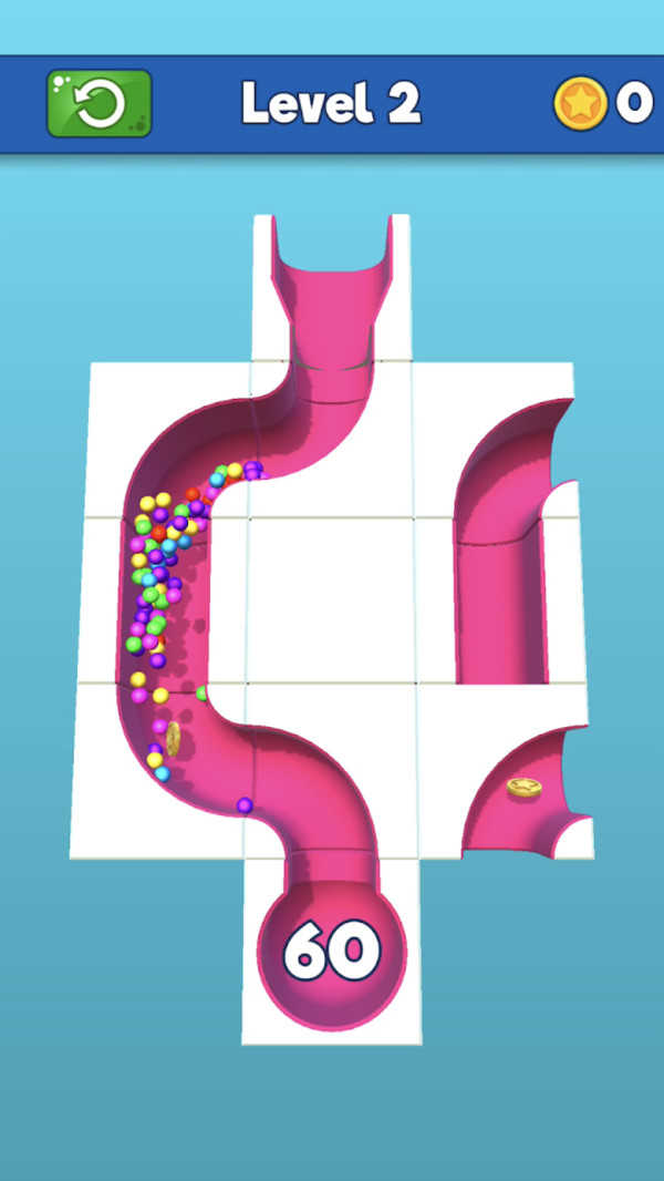 1、管道拼接玩法:提供弯管、T型管、螺旋管等10余种异形管道,需根据关卡地形与小球起始点,旋转拼接管道形成通路,考验空间思维与路径规划能力。