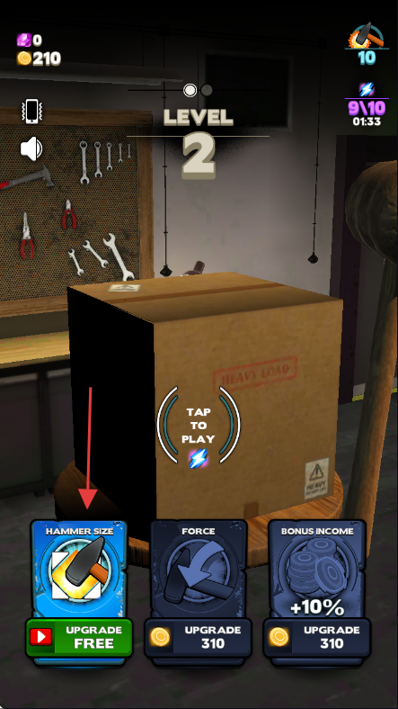 2、【LEVEL2】中【HAMMER SIZE】升级锤子大小,提升操作效率。