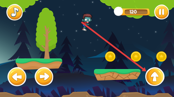 2、遇到障碍物或高台时,点击跳跃按钮,操控小僵尸跃起躲避陷阱或跨越间隙。