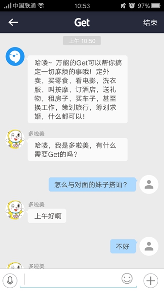 Get的核心业务是通过人工对接的方式帮助用户解决生活中能够想得出的烦恼和需求。除了处理一些高频的标准化生活服务比如点餐,打车,洗衣,Get更加倾向于做现实中的“浪矢杂货铺”,帮助用户做一些能够减轻他们焦虑的决定。比如是否应该修理家电还是买一件新的,比如和男友分手后是否需要复合等等。目前Get主要通过App与微信(微信号:Get一下)提供服务,页面也是以即时通讯的文本页面为主。