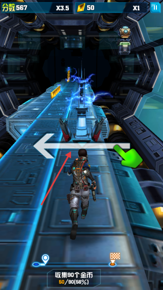 2、跟随箭头指示方向移动角色,收集金币,同时注意躲避障碍,完成【收集90个金币】等任务。