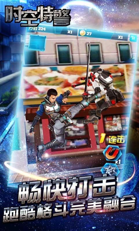 3、沉浸式剧情体验:关卡模式穿插动态漫画讲述时空特警任务,从追踪犯罪集团到阻止时空危机,剧情紧凑连贯,让玩家在跑酷格斗中感受跌宕起伏的冒险故事。