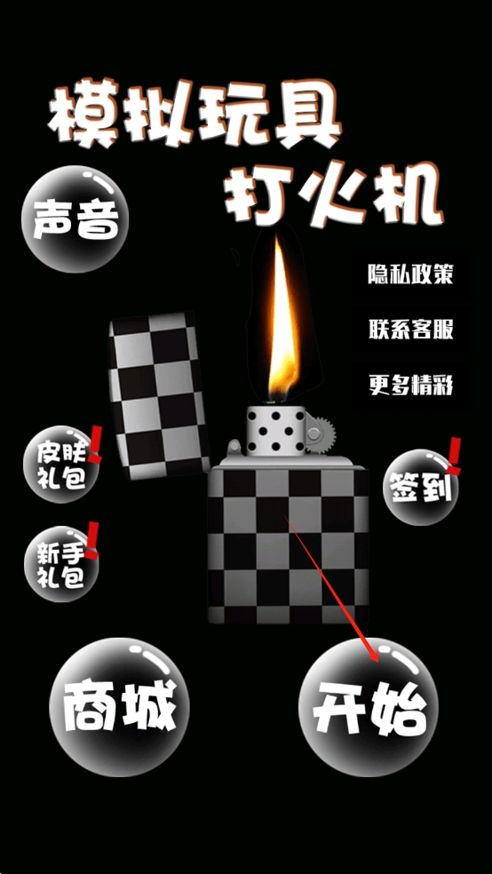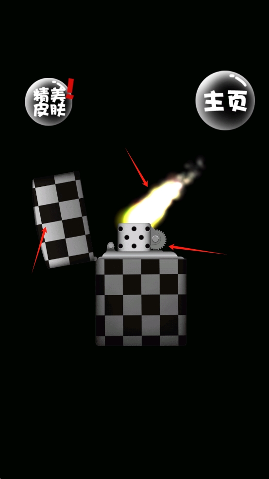 1、进入游戏界面,首先映入眼帘的是多款打火机样式,点击选中心仪款式,通过滑动屏幕模拟擦拭动作点火。