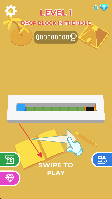 1、进入【LEVEL1】,根据提示【DROP BLOCK IN THE HOLE】,通过【SWIPE TO PLAY】滑动操作开始游戏,目标是将方块放入洞中。
