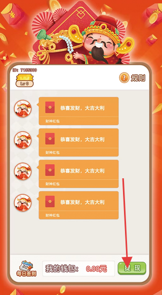 3、获得财神红包累计到【我的钱包】,满足条件时点击右下角【提现】按钮提现金额。