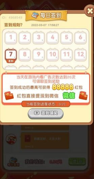 2、游戏内当天看广告达20次,点击【签到领奖】完成签到,成功后最高得88888红包且可提现至微信,可查看当前签到进度。